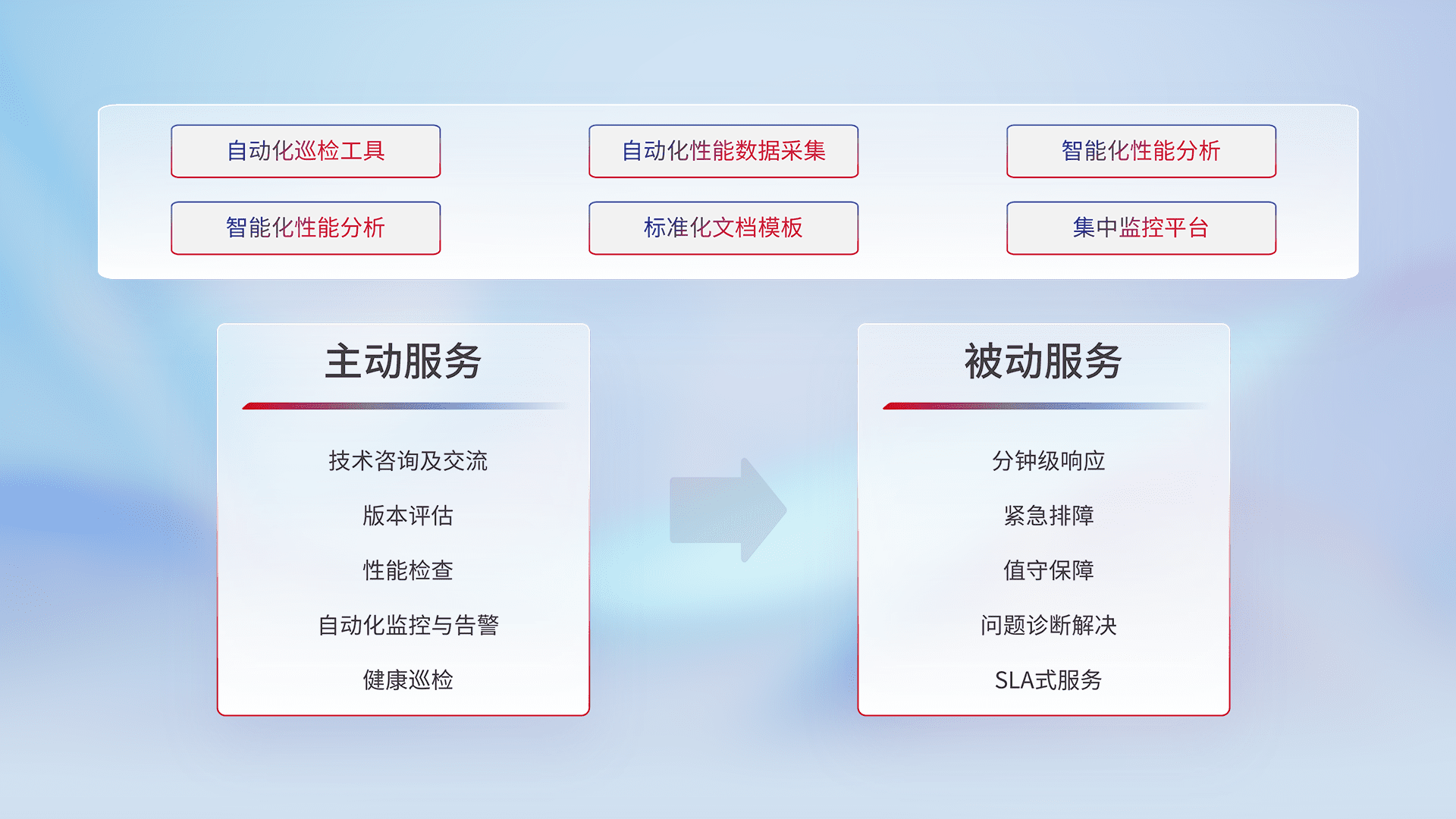 智能化工具和标准化文档,,保障服务质量,,,提供主动服务(包含技术咨询、、、、版本评估、、、、性能检查、、、自动化监控与告警、、、健康巡检)和被动服务包含(分钟级响应、、紧急排障、、、、值守保障、、问题诊断解决、、SLA服务)。。。。